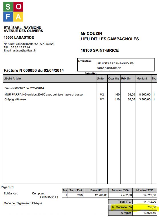 Ensuite lorsque vous imprimez la facture le montant de la retenue de garantie est calculé automatiquement et apparaît en bas de document comme ci-dessous: