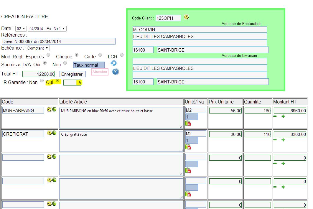 Dans l’écran de gestion des factures il suffit de cocher Oui en face de l’information R.Garantie et de saisir le taux de celle-ci dans le champ à côté; voir illustration ci-dessous
